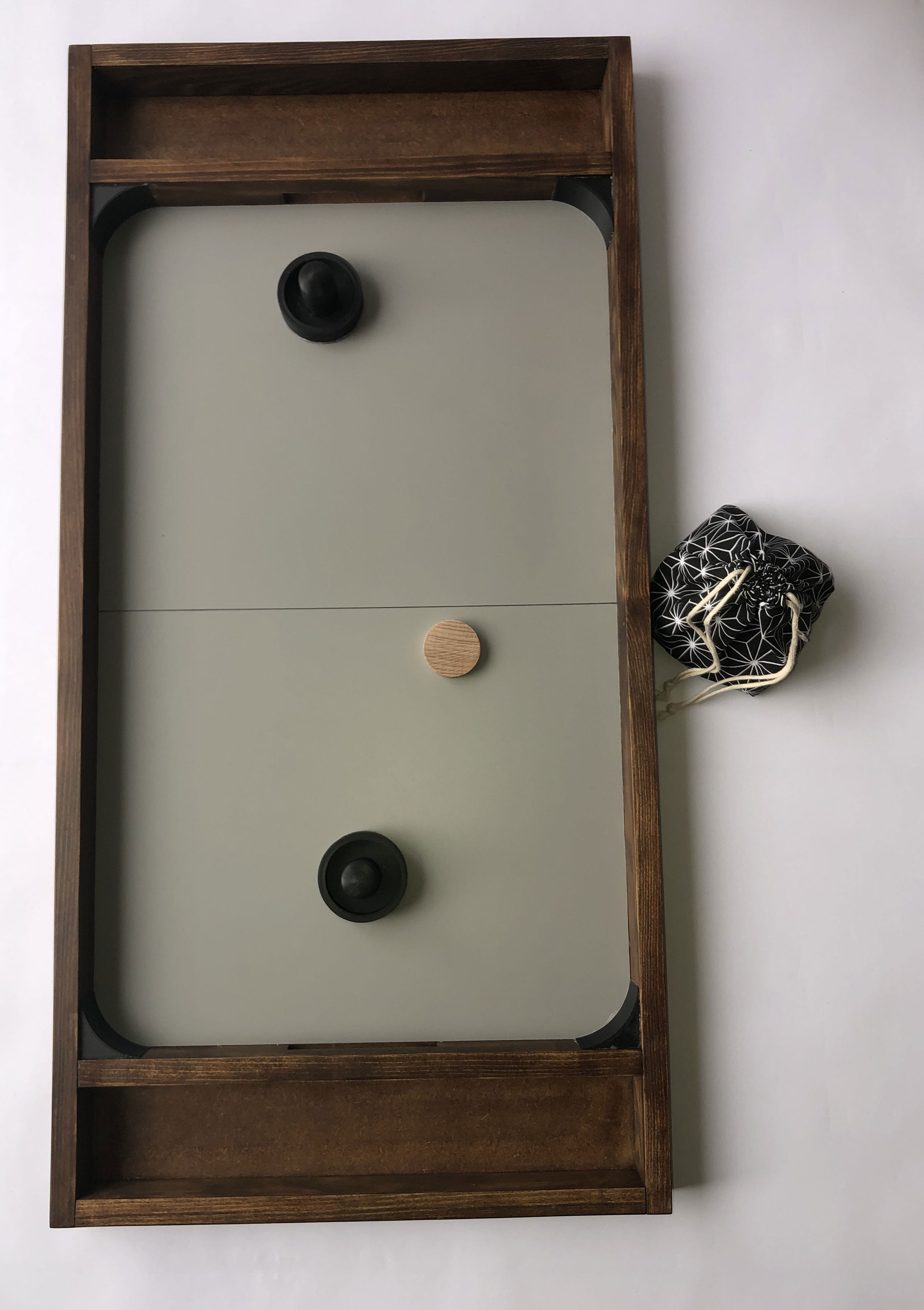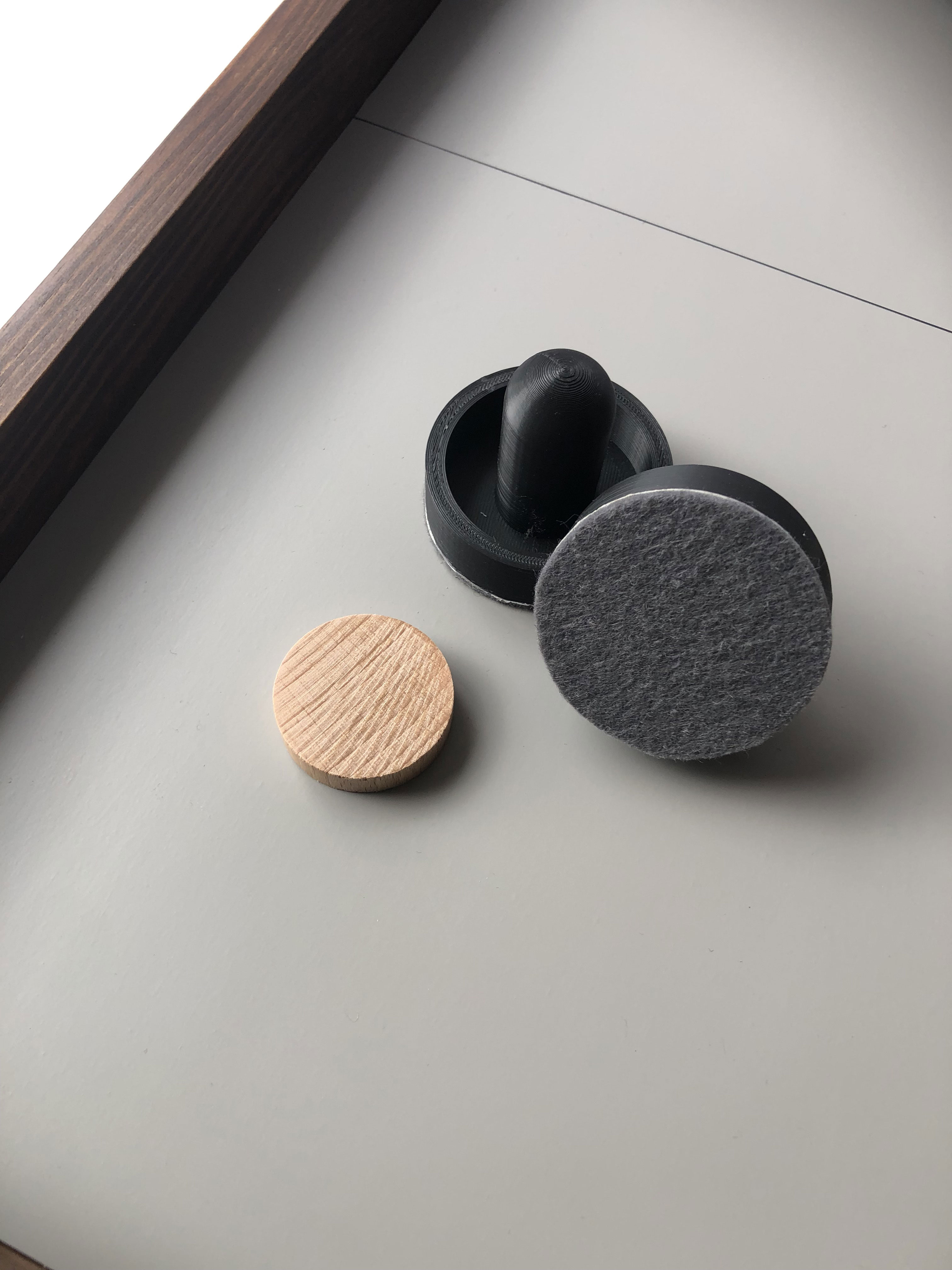 - Mise en place : Chaque joueur prend un maillet et se place devant son but. Le palet est placé au centre de la table pour débuter la partie.